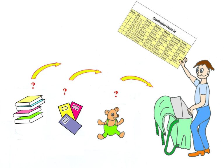 In den ersten Wochen schleppte er an jedem Tag alle seine Schulbücher und Hefte in die Schule, also auch die, die er nicht brauchte. Die Schultasche war viel zu schwer. Erst als ich ihm riet, sich in der kleinen Wohnung einen festen Arbeitsplatz einzurichten, dort seinen Stundenplan aufzuhängen und an jedem Nachmittag nachzuschauen, welche Materialien er denn tatsächlich am nächsten Schultag brauchte, wurde seine Schultasche erheblich leichter. „3 Kilo weniger“, berichtete er mir dankbar.
