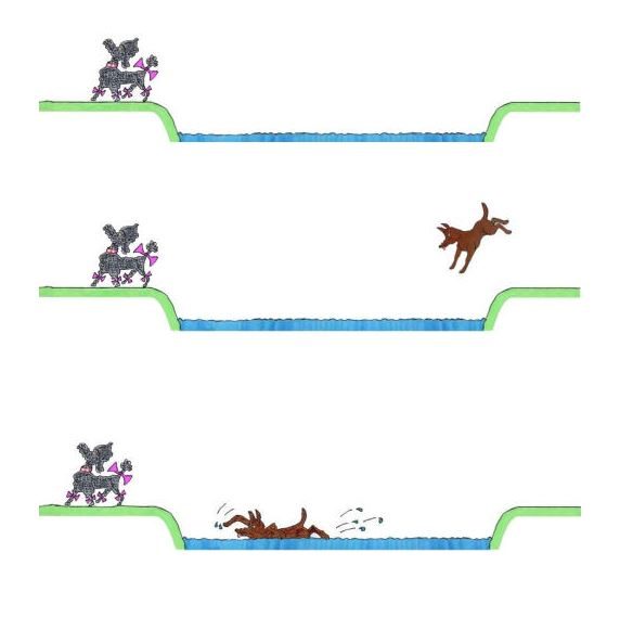 Plötzlich blieb er stehen, hob die Nase in die Luft und stürzte sich mutig in die Alster, um ans andere Ufer zu schwimmen. Dort ging eine Hündin spazieren, deren verführerischer Duft über die Alster direkt in Dukes Nase geweht war. Duke konnte da einfach nicht widerstehen und versuchte sein Glück.