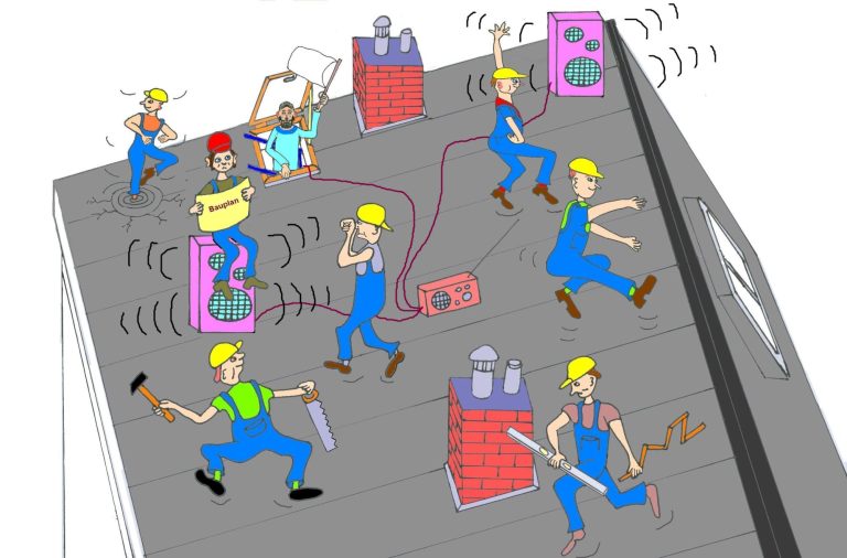 In Karikaturen wird zwar häufig etwas übertrieben, aber das folgende Ereignis habe ich tatsächlich so erlebt. Einer der Handwerker ließ sich mehrmals mit dem Schrägaufzug auf das Dach transportieren. Einmal saß er sogar auf einem Stapel Dachlatten. Der junge Dachdeckergeselle war zu bequem, die Leitern des Gerüstes zu benutzen. Meinen Hinweis auf die große Unfallgefahr nahm er zunächst nicht ernst. Erst nach einiger Zeit gab er sein leichtsinniges Verhalten auf. So brauchte ich nicht damit zu drohen, ihm das Betreten der Baustelle zu untersagen und die Gewerbeaufsicht einzuschalten.